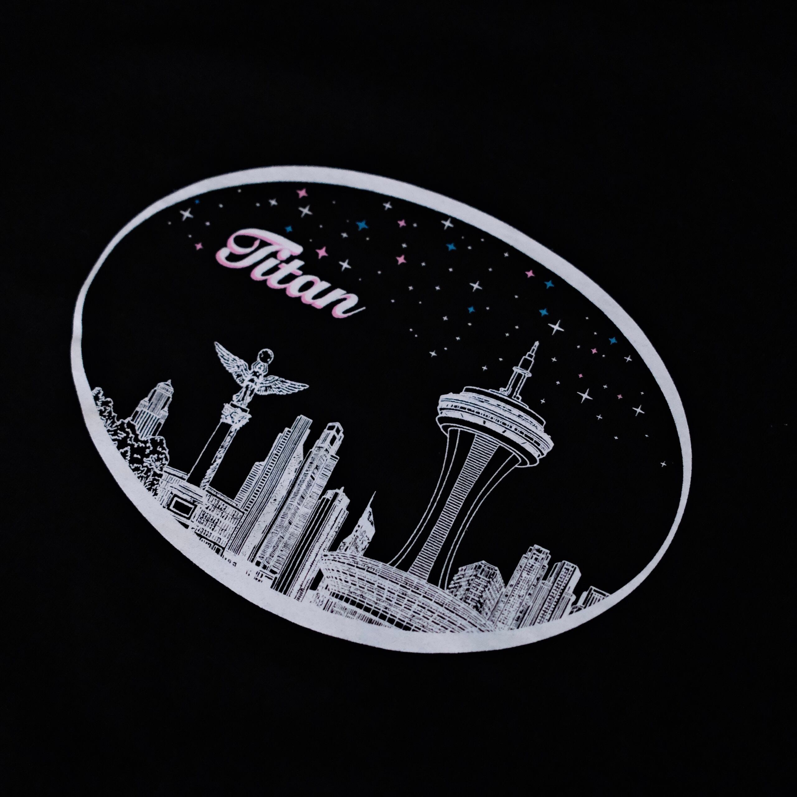 映画『Gattaca』をはじめ、さまざまな作品の中で「楽園」として描かれてきた架空の惑星・都市をモチーフに、90年代の観光地スーベニアTシャツを思わせるデザインに仕上げました。USA製のボディにプリントしています。
